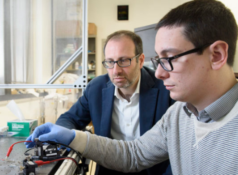 材料科学与工程学副教授Alberto Salleo和研究生Scott Scott于2017年拍摄的照片描述了以前的人工突触设计的电化学特性。他们最新的人工突触是一种与活细胞整合的生物杂交装置。图片来源:斯坦福大学LA Cicero