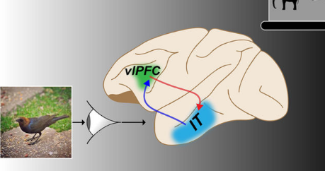 麻省理工学院的研究人员使用对象识别任务(例如,识别出图中显示的是“鸟”而不是“大象”)来研究从灵长类动物腹侧前额叶皮层(vlPFC)到颞下叶(IT)的反馈的作用。皮层通过神经元网络。在灵长类动物的大脑中,暂时阻断vlPFC(绿色阴影区域)会破坏包含vlPFC和IT的循环神经网络,从而导致特定缺陷,并暗示其在快速物体识别中的作用。图片来源:Kohitij Kar;大脑图像改编自SciDraw。